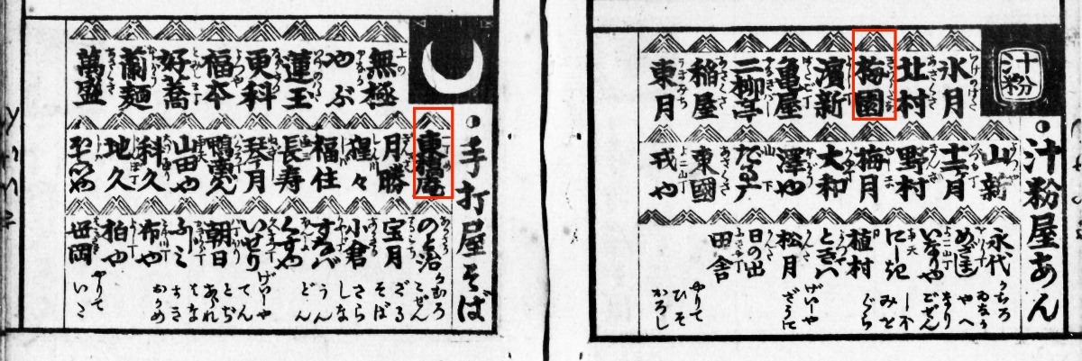 いまも浅草に本店を構える老舗甘味処で、 安政元年(1854)に浅草寺の別院「梅園院」の一角に開いた茶屋が始まりだ。初めて売り出したという粟ぜんざいは筆者も大好きだが、木原店に店があったとは知らなかった。いつ頃から木原店に店があったかは不明だが、評判の店を格付けする明治18年(1885)刊『東京流行細見記』の汁粉屋の項には、すでに〈きわらだな 梅園〉とある。