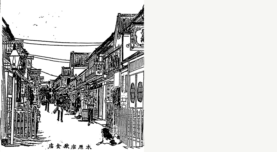身分制度が解かれ、新しい時代を迎えた首都、東京の一隅。老舗に高級店、気安い居酒屋と雑多な店が等しく並び、食を楽しむことを覚えた人々は、新聞や雑誌の情報を片手に、それぞれ目当ての店を目指す。新しいメディアの追い風を受けて栄えた木原店は、いまでこそ珍しくはないが、当時は時代の自由な空気が生んだ夢の路地だったのである。