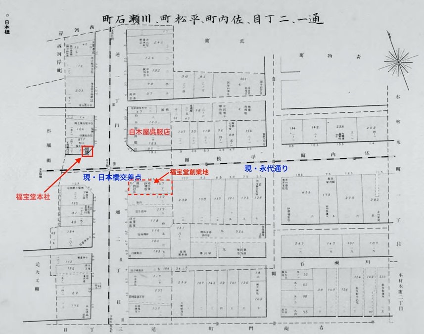 大正元年(1912)刊『東京市及接続郡部地籍地図 上卷』掲載の「日本橋区」地図(提供・国立国会図書館デジタルコレクション)。日本橋交差点の西北角の通一丁目13番地に小さく「映画会社/福宝堂」の文字が見える