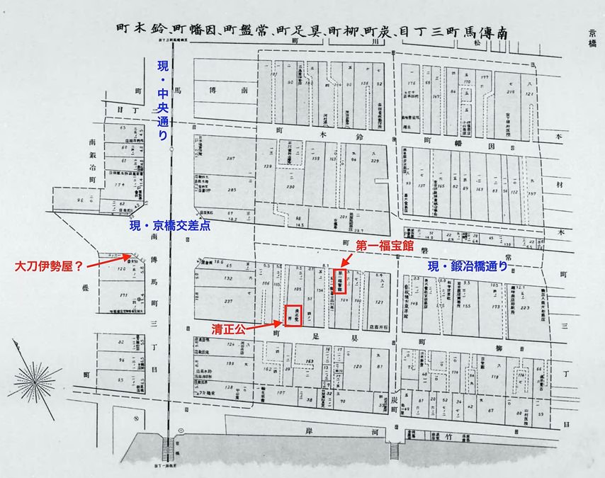 京橋育ちの映画人に、明治41年(1908)生まれの映画評論家・筈見恒夫(はずみつねお、1908-1958)がいる。母方の実家は、江戸から続く「大刀伊勢屋」という老舗の紙商だった。大刀の絵柄を中央に赤く染め出した紺暖簾がトレードマークで、仲田定之助著『明治商売往来』によると、南伝馬町四丁目(後に三丁目に編入)の西南角にあった。大正時代の地図をあわせ見るに、現在の京橋三丁目1番地、京橋交差点に面した東京スクエアガーデンの角あたりだろうか。この角といえば、古くはおしろい、維新後にこうもり傘を売り始めた「仙女香」という店が有名だが、大刀伊勢屋もその並びにあったとしたら、第一福宝館まで歩いて3分とかからない場所だ。