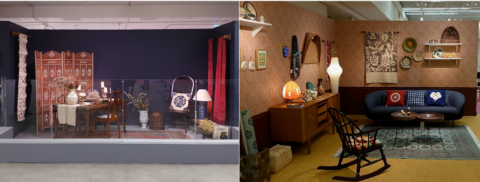 令和2年(2020)の民藝展で提案されたコンセプトルーム。左はモデル・女優の知花くらら氏による「心地いい民藝」、右はインテリアスタイリストの中林友紀氏による「民藝と暮らす」をテーマにした展示。(写真提供:髙島屋)