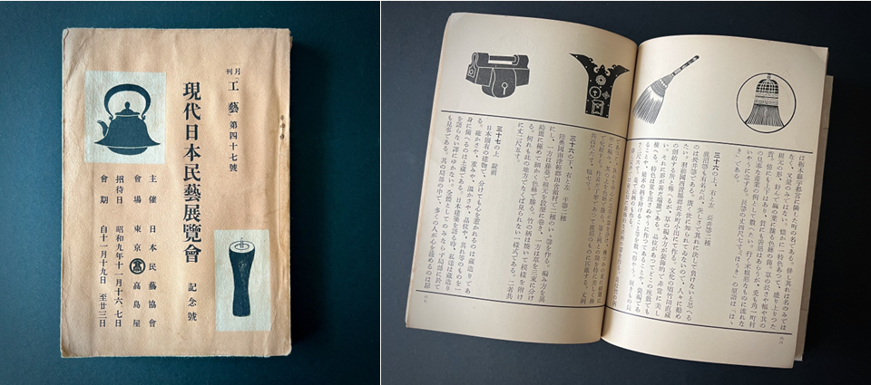 「現代日本民藝展覧会」のカタログ(1934年11月、日本民藝協会)。解説には、130種近い芹沢銈介の小間絵が添えられている。(筆者撮影)