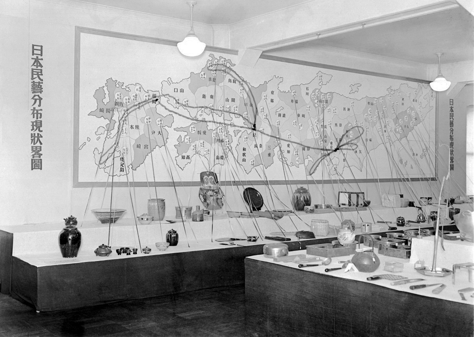 会場は、瓦屋根がのった白壁の塀で仕切られ、塀の前からすでに大甕(おおがめ)や大鉢がゴロゴロと床に置かれている。会場内に入ると、小型の箪笥、それに甕や鉢、壺が目に飛び込んでくる。展示台にぎっしり並べられた小皿や小鉢の類。わっぱや漆器、さじなど大小の木漆工品を集めた台に、錠前から大鍋、五徳、刃物までこまごまと金工品が並ぶ台もある。壁際にはずらりと掲げられた北国の蓑やけらが華を添え、手前にはかごや、ざる、箒などの編組品が陳列されている。染織品が並ぶスペースもあれば、座布団や団扇、凧、馬具といったものもある。目を引くのは「日本民藝分布現状略図」と題された展示だ。壁に掲げられた地図から紐が伸び、産地と現物を結びつけて示す。黒い線は、旅した軌跡の一部を表しているのだろうか。二次元の図を三次元でわかりやすく表そうとしたこの試みに、会にかける柳らの意気込みが伝わってくる。