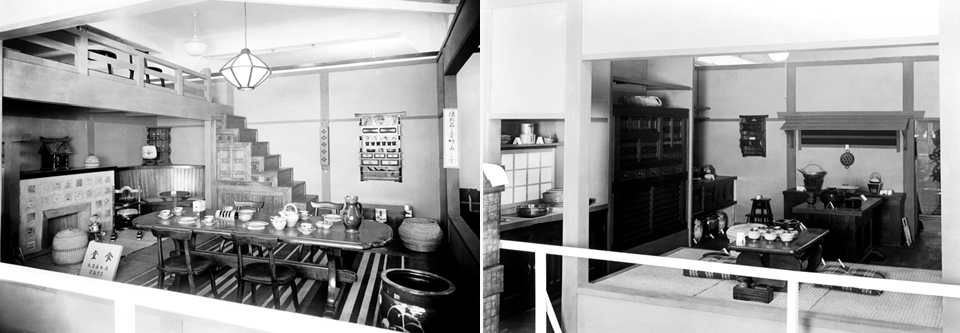 「現代日本民藝展」のモデルルーム。左は濱田庄司設計の食堂、右は河井寬次郎設計の台所。(写真提供:民藝フィルムアーカイブ)