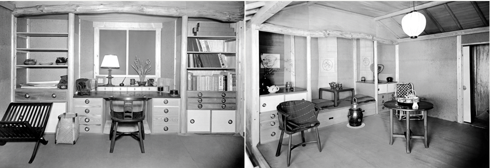 なかでも一番の見どころは、3種のモデルルームだ。濱田設計の食堂は、暖炉やテーブル、椅子といった西洋のしつらえに、サイドボードとして階段箪笥をあわせたところがポイントだろう。河井設計の台所は、畳敷きの小上がりを取り囲むように調理台や火気、水場を配した贅沢な造り。リーチ設計の書斎は、床の間をアレンジし、一方につくりつけのデスクと書棚、他方に座卓を置き、効率よく和洋折衷を実現している。