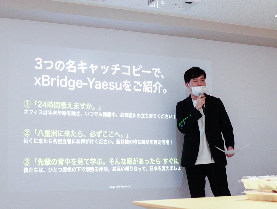 まずは「xBridge - Yaesuの使い倒し方」と題して、本施設の3つの注目ポイントが紹介されました。一つ目は、年末年始を除いて24時間使えるフレキシビリティ。二つ目は、駅徒歩一分でちょっとした空き時間にも立ち寄れる気軽さ。そして三つ目は、いつでも何でも相談し合える信頼性。『xBridge - Yaesu』のフロアには、代表の手嶋氏・西城氏を含むXTech Ventures一同が在席しており、これによって入居者各位が常時、壁打ち相手としてベンチャーキャピタリスト達に気軽に話しかけられる環境が用意されています。また、東京駅周辺エリアという立地を活かして、各種の勉強会・交流会・オフラインイベントを開催し、大手事業会社と周辺のスタートアップ関係者・起業家を繋ぐネットワークを構築していきます。こうした現実空間ならではの深い対話や起業家どうしでの切磋琢磨は、起業直後で充分なネットワークや知見を持たないシード期の起業家にとって、特に有意義な環境といえるでしょう。また、出資元であるLPやパートナー達が。いつでも気軽に訪れることが出来る八重洲ならではの利便性は、『xBridge - Yaesu』が兼ね備える魅力の一つです。