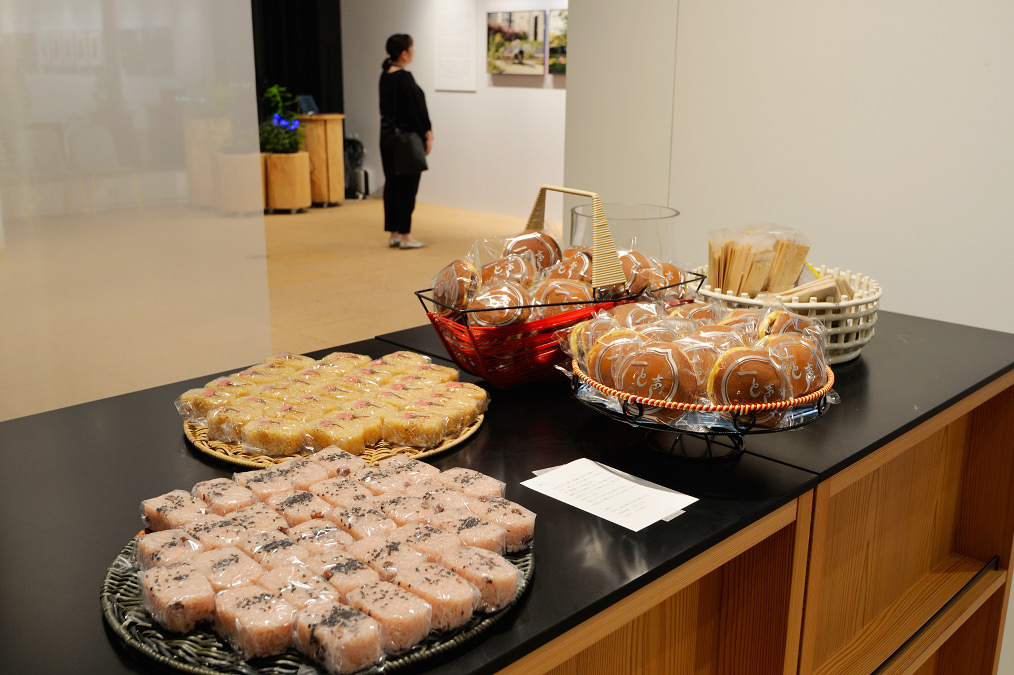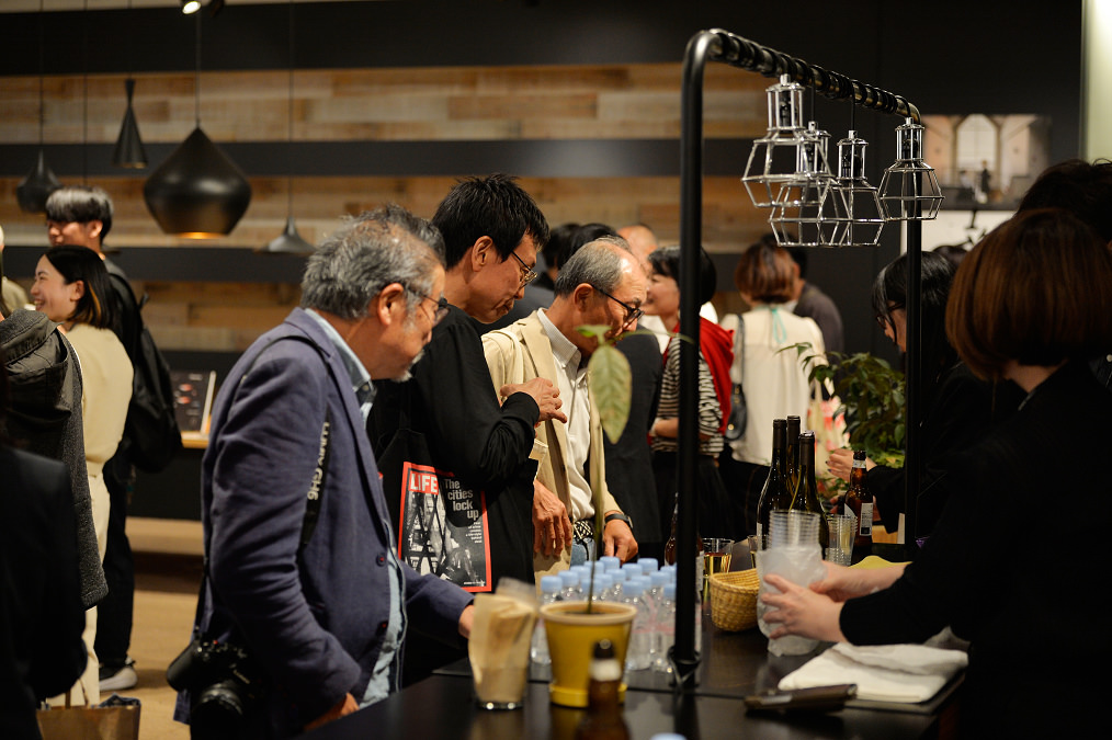 会場には地元・京橋で150年以上続く老舗和菓子店「桃六」のどら焼きとおこわが並び、カウンターでは旭酒造の日本酒「獺祭」、ベルギーのホワイトビール「ヒューガルデン」などドリンク類が提供されました。