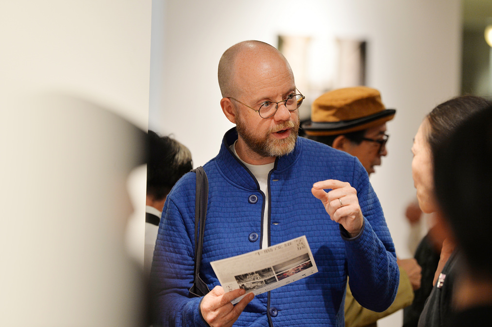関係者と談笑するキュレーターのマーク・フューステルさん