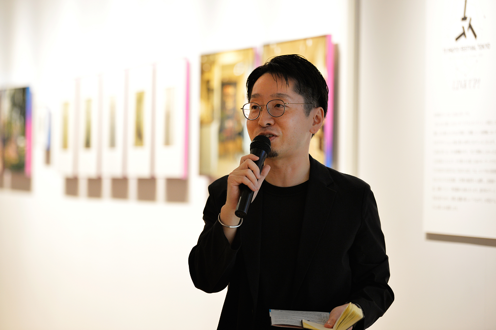 交流会当日は多くの海外ゲストも来場し、速水さんから国内組を含めた、出展作家と関係者が紹介されました。その後、出展作家を代表して写真家の寺田健人さんからご挨拶がありました。
