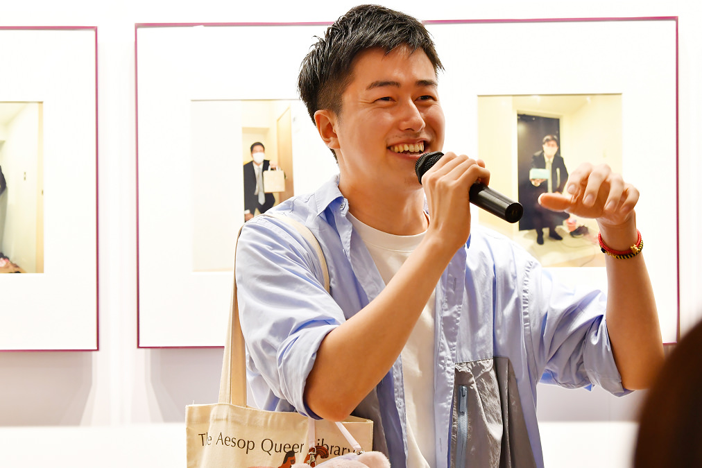 「私は普段、『家族』をテーマに作品作りをしていまして、透明な家族と暮らす一人の父親の物語を写真で撮っています。自分がゲイとして生まれ、ことあるごとに『彼女は?』『好きな女性のタイプは?』と聞かれ、それをどうにかやり過ごしてきました。これは自分だけでなく、多くの当事者が体験してきたことです。この経験やそれを通して感じたネガティブな思いを、作品を通してポジティブな思いに変えていきたいという気持ちで作り始めました。一般的に母親がキッチンに立って、父親はダイニングで椅子に座るというような性的役割みたいなものがあると思います。そのような固定概念に対して『それでいいのか?』と問いかけるような作品にしたいと思って制作しています」(寺田さん)
