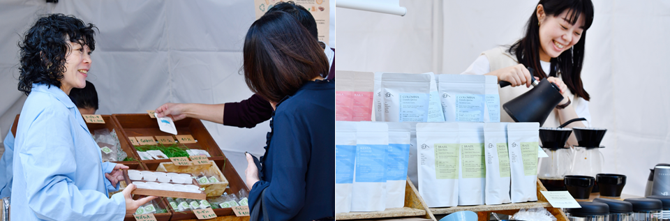 左)「SOI Inc」のブースでは、廃棄されてきたコーヒー残滓でアップサイクル×ゼロウェイストな技術「UP 0 TECH®」が産み出したエシカルスイーツを販売