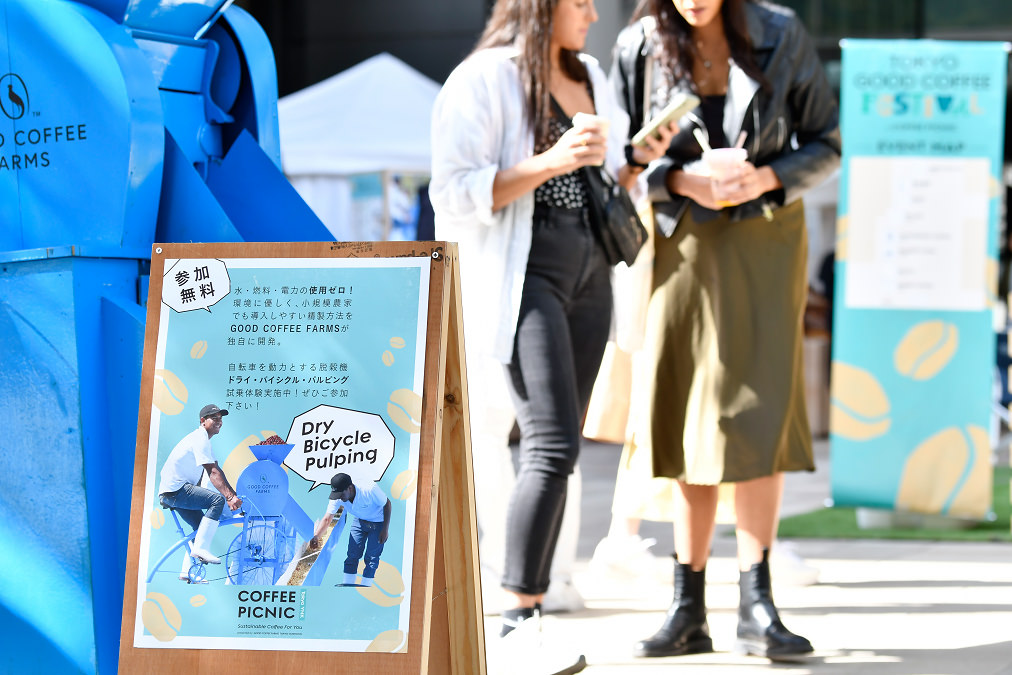 ご存じのとおり、コーヒーは、生産者がつくり、焙煎士が焙煎し、バリスタが抽出することで初めておいしい1杯となって、私たち消費者の口に入ります。「COFFEE PICNIC」の一環で初開催された「TOKYO GOOD COFFEE FESTIVAL」(TGCF)では、会場の東京スクエアガーデンに全国各地から集まったロースタリーカフェがこの日のために特別に焙煎したGCFのコーヒーを提供。独自の自転車脱穀機「ドライ・バイシクル・パルピング」により、水・電気・燃料を一切使用せずにつくられた生豆の個性を最大限に引き出す工夫は三者三様で、その味は無限大です。来場者は、お好きなコーヒーブースで飲み比べが楽しめるチケットを手に、コーヒー生産者の想いが込められた新しいコーヒーとの出会いに胸を躍らせていました。