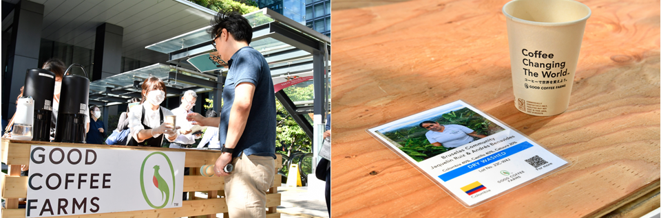 毎年恒例で行列必至のサステナブルコーヒーの無料配布。生産者がわかるように表示されていた