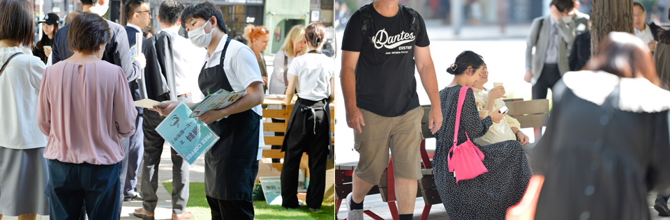 平日のオフィス街で行われたフリーコーヒーだが、オフィスワーカーに交じって外国人旅行者や近隣住民の姿も