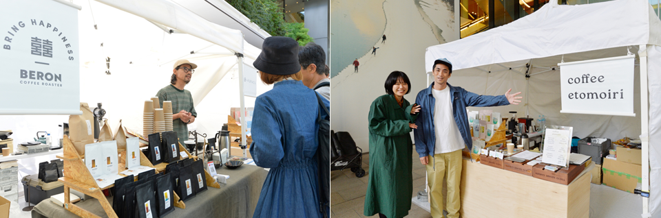 右)競技会で審査員や品評会で受賞歴のある焙煎士の望月光さん(右)がオーナーを務める「Coffee etomoiri」のブース