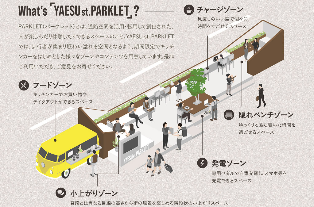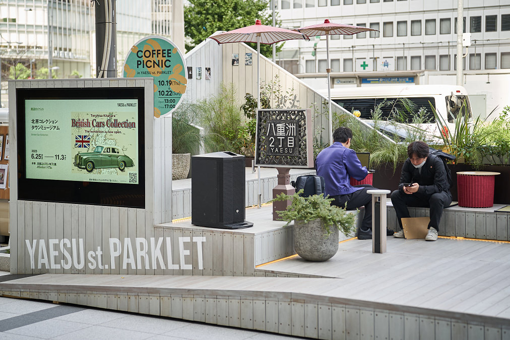 YAESU st. PARKLETを主催したのは、東京駅前地区駐車対策協議会と東京駅前地区まちづくり推進協議会。両者とも「東京駅前地区」と呼ばれる八重洲・日本橋・京橋エリアで活動しており、地元町会や企業で構成されています。