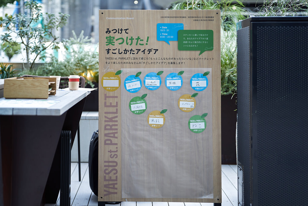 来場者がパークレットで過ごして感じた、「パークレットをもっと楽しむためのアイデア」を書いて掲示するコーナーも