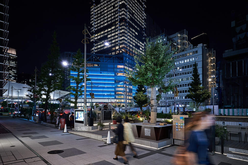 再開発により大規模な商業ビルやオフィスビルが建設され、近年大きく変わりつつある東京駅前地区。エリア全体の魅力を向上させるため、「歩いて楽しい通り空間」として道路を利活用し、地区内の人の回遊を促す検討が進んでいます。そのために必要な社会実験を行っていく予定で、YAESU st. PARKLETはその第一弾という位置付けです。