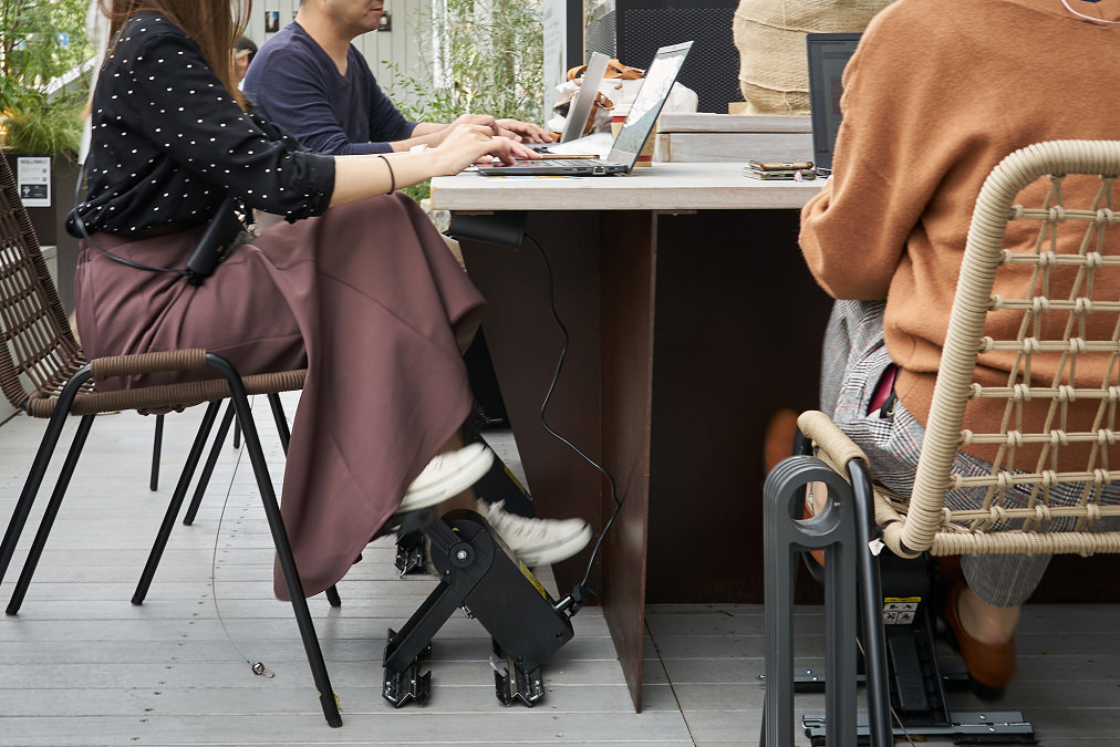 コンセントやWi-Fiも用意されていて、自由に使うことができます。中央のテーブルにはペダル発電機が備わっていて、近隣のオフィスワーカーと思われる人たちがパソコンで作業しながらペダルを漕いでいました。仕事をしながら運動不足も解消できそうですね。