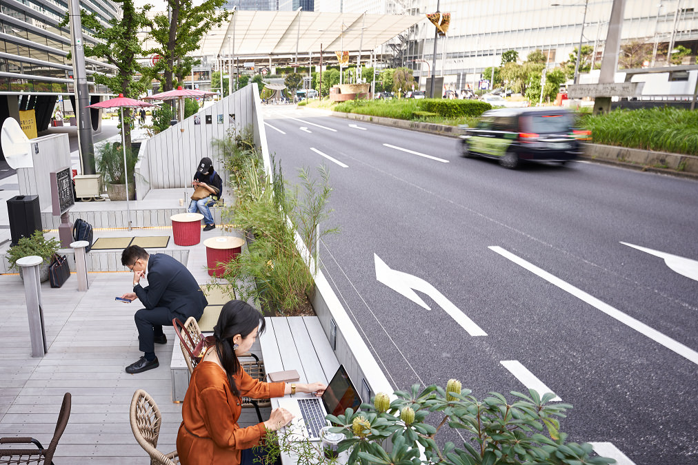 今回のYAESU st.PARKLETは、道路空間の一部を一体的に活用して設置されたもの。八重洲通りの車道のうち路肩として使われていた空間と歩道の一部に跨っています。また、パークレットを設置しても、歩道部分は3.5メートル以上確保されており、歩行者の通行にはほとんど影響がなかったように見受けられました。