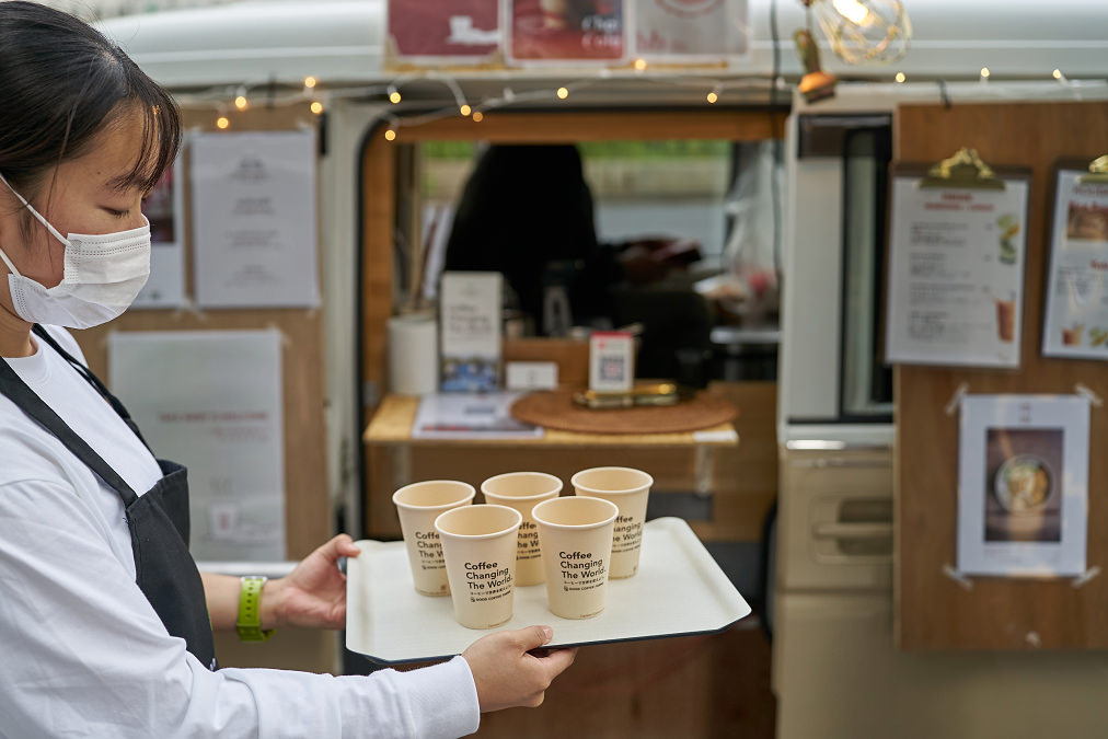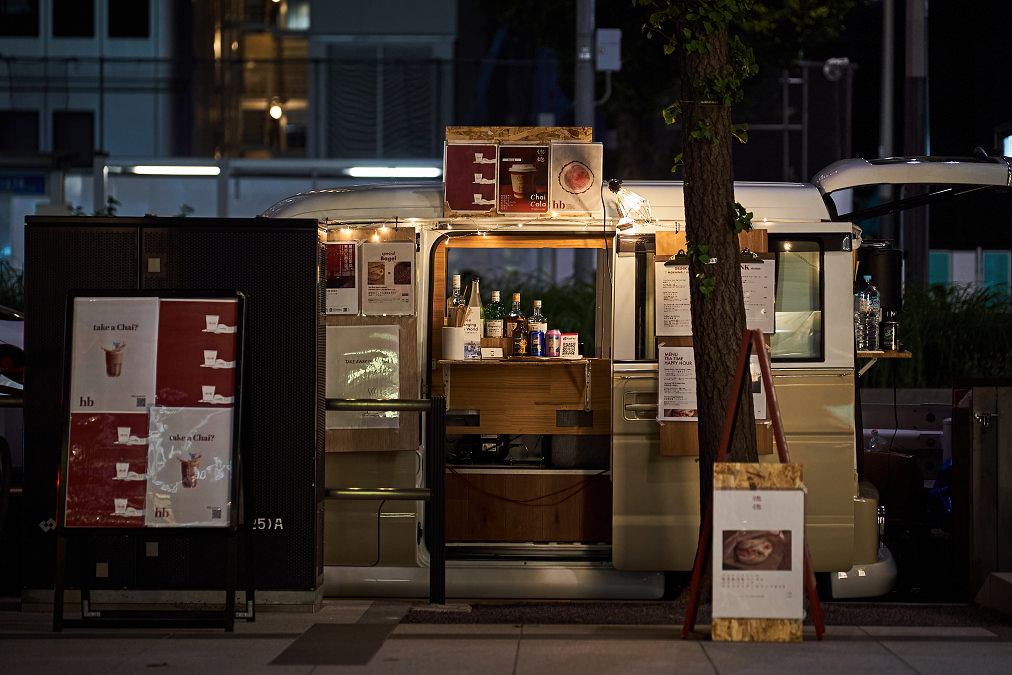 小上がりゾーンの向こうはフードゾーン。薬膳喫茶「惚惚」のキッチンカーが停まっていて、フードやデザート、ドリンクを販売していました。もちろん、パークレット内で食べることができます。また、地域のイベントと連携した取り組みをしていたのも特徴です。2021年から毎年10月に八重洲・日本橋・京橋エリアで開催されているイベント「COFFEE PICNIC」の一環として、休憩中の人にフリーコーヒーが振る舞われるタイミングもありました。