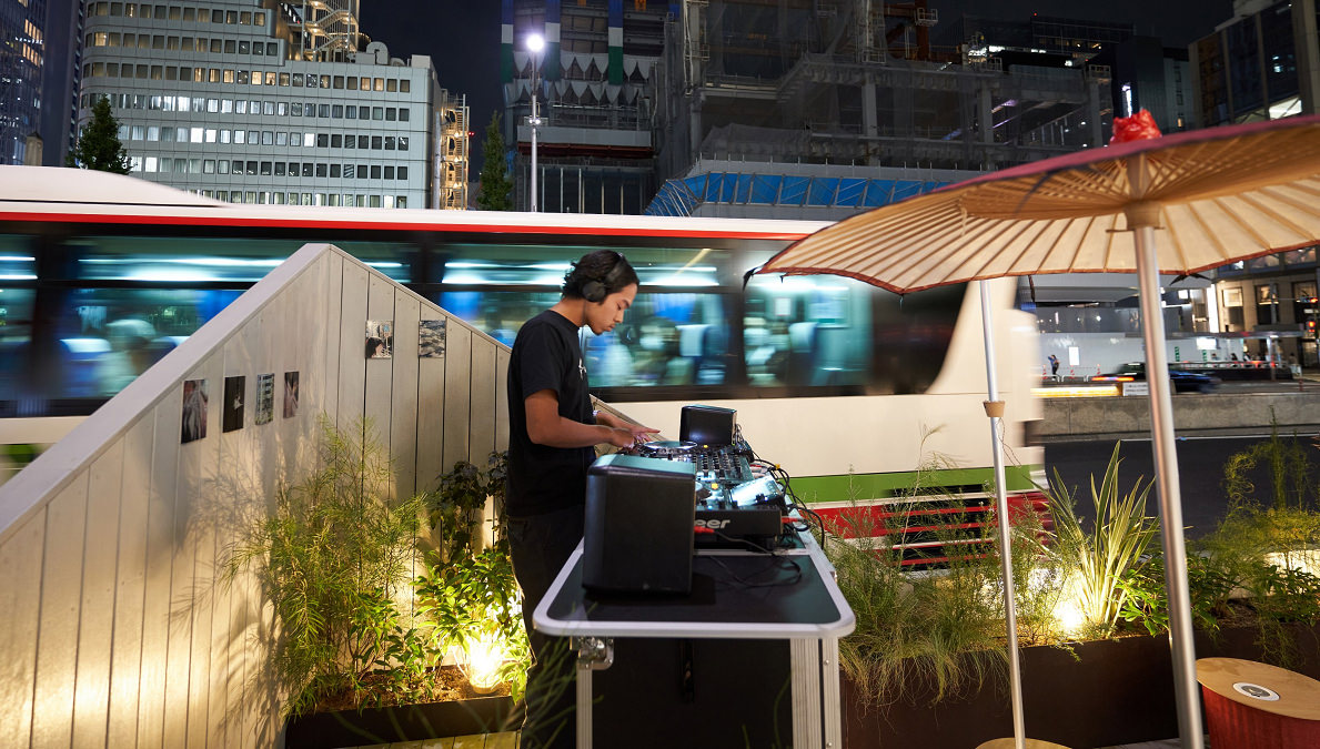 日が暮れると、小上がりのステージにDJが現れました。リラックスできる音楽が流れてライトも灯り、なんともいい雰囲気。足早に通りを歩いていた人が、「なんだろう?」と立ち止まって眺める場面も。仕事帰りに同僚と立ち寄って一杯、というのも楽しそうですね。