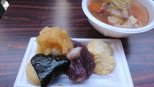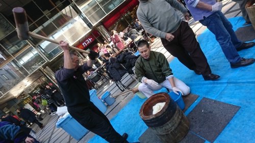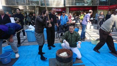 蒸したてのもち米が会場に届くたびに、3基の臼と杵でどんどんつかれていきます。 来場したお子様や女性や力持ちの男性も餅つきに参加してたくさんのおもちが出来上がり、 きな粉、あんこ、からみ、磯部で仕上げたおもちと、併せて用意された豚汁を頬張りながら談笑する 賑やかなイベントとなりました。