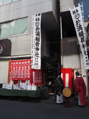日本橋三丁目にある「いづみや」さんと「八重洲大飯店」さんの間に佇む「於満稲荷(おまんいなり)神社」。