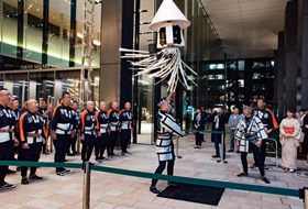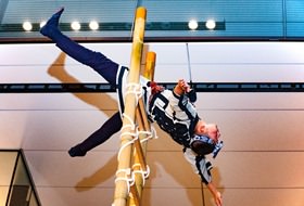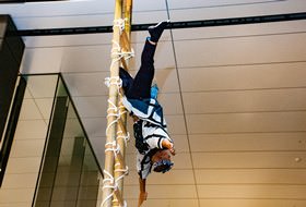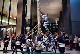 東京スクエアガーデン1階貫通通路で行われた(一社)江戸消防記念会による「はしご乗りと木遣り等の演技披露」。間近で見ることができ、演者の熱気が観客にも広まります。