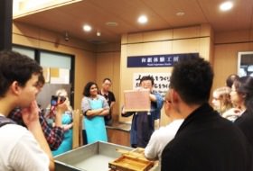 小津和紙3階で原料の収穫から[紙]が完成するまでをシアター形式で学習した後、1階の工房にて紙漉き体験。こちらは作業工程毎にお店のスタップとアンバサダーが待機するかたちになり、滞りなく体験が進みました。職人レベル、とはいかないものの、ゲストは自分で作った和紙独特の触り心地を体感し、満足そうでした。