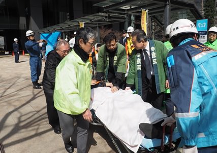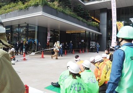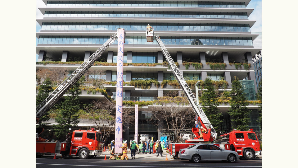3月1日~3月7日の「春の火災予防運動」の一環として、東京スクエアガーデンの貫通通路にて、京橋消防署による消防演習が地元町会等の協力のもと行われました。