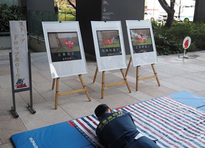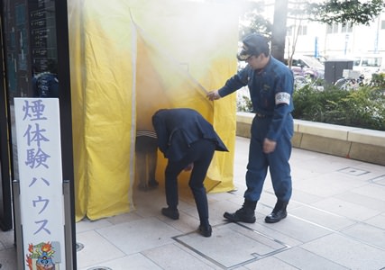 集まった多くの方々に向けて、煙体験ハウス、消火器体験コーナー、AED体験コーナー等も用意されました。バーベキューや花火等、着衣に着火した場合の対処法、ストップ、ドロップ&ロール(止まって、倒れて、転がって)の紹介もされていました。
