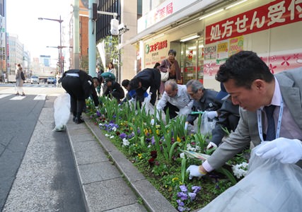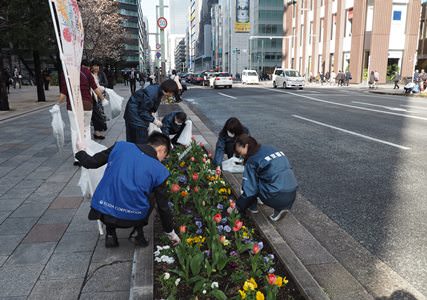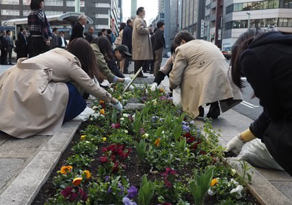 京橋~日本橋本町にかけての中央通りには、四季を彩る花壇が設置されていて、現在は色とりどりの「パンジー」と「チューリップ」が中央通りに彩りと潤いを与えています。