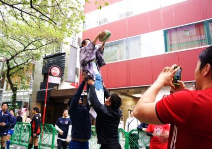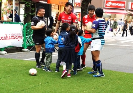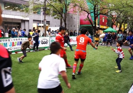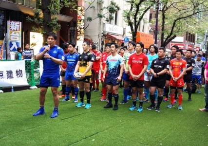 7日(土)は、八重洲センタービル前の道路に人工芝が敷かれ、ジャパンラグビートップリーグ16チームから32名の選手が大集結。