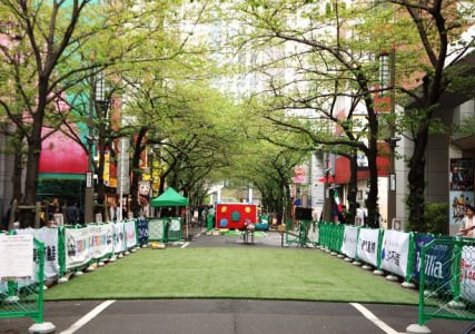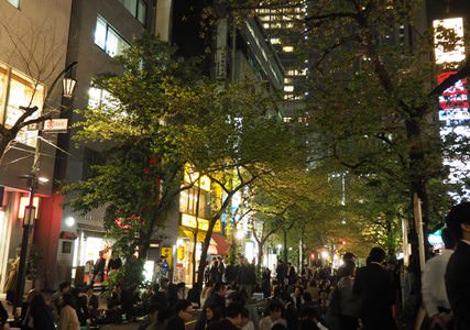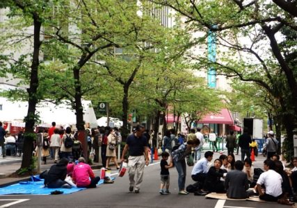 開催期間中、さくら通りの一部区間で夜桜のライトアップが施されたほか、車道を歩行者天国として一時的に開放(通称、お花見天国)。多くの花見客がシートを広げて、家族や友人、会社の同僚などと若葉を楽しむ姿が見られました。