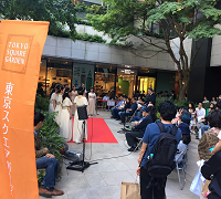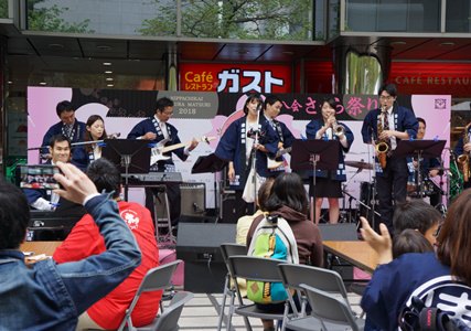 フードトラックや模擬店も出店した日本橋プラザビル前には、特設ステージが登場。生ライブ、ダンス、大道芸、演武、落語などのステージを楽しむ人、お酒や軽食を楽しむ人など、皆思い思いに過ごす中、ひときわ会場を盛り上げたのは、地元企業や地域の飲食店関係者や地元企業の社員らのステージです。