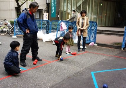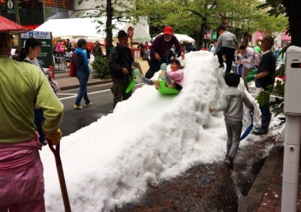 お花見天国の中には、「ボッチャ」という老若男女・身体が不自由な方も楽しめるスポーツの体験コーナー、新潟県津南町と長野県栄村からトラックで運ばれた雪の滑り台などが作られ、普段車通りの多いさくら通りが大変身。雪遊びやシャボン玉遊びに夢中になる子どもたちの様子に、見守る大人たちの顔もほころんでいました。