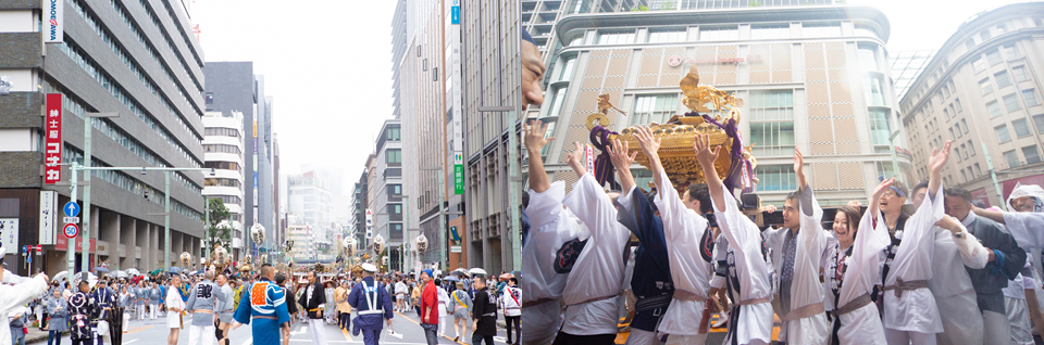 山王祭は20以上の諸祭典を含めた総称です。今年は6月7日(木)から11日間にわたる祭りの日程が組まれ、日本橋から八丁堀までの、いわゆる江戸城下の下町の神輿の出番は6月8日(金)・9日(土)・10日(日)の3日間。10日には、それまで自町内を巡行していた各町の神輿が一堂に会する山王祭の見せ場、「下町連合渡御」があります。