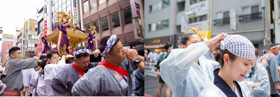 合計約1.5キロを約2時間半かけて巡行する下町連合渡御。さすがに身体に疲労がたまってきますが、その時々で周囲の人に目を合わせると担ぎを交代してくれます。こうしてかわるがわる神輿を担ぎ、日本橋のたもとにたどりつくと、鳶頭衆が木遣りを唄いながら先導。担ぎ手たちが天に向かって神輿を差し上げ、祭りは最高潮に。辺りには声援とも怒号とも取れる声が響き、歳事に燃える日本人の原点を垣間見た気がします。だって、どの男も女も輝いて、最高にかっこいい!