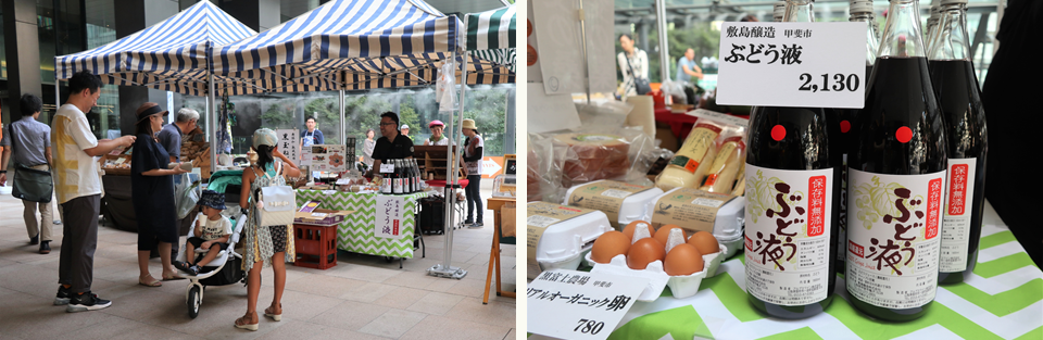 珍しい商品をもうひとつご紹介します。「KAISTYLE甲斐マルシェ」さんのブースで見つけた、敷島醸造のぶどう液です。爽やかな酸味と甘みが絶妙で、その濃厚な味わいはまるでフルーツをそのまま食べているかのよう。ストレートでも、炭酸水等で割っても楽しめます。山梨県甲斐市の特産品に特化して販売を行う「KAISTYLE甲斐マルシェ」さんいわく、写真の一升瓶タイプは都内ではほぼ出回っていないそうです。