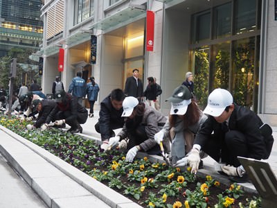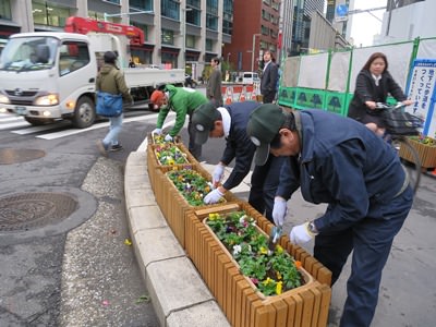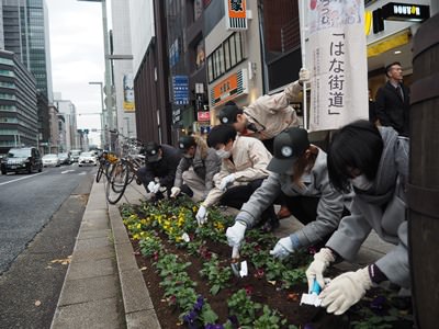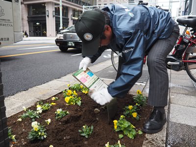 京橋~日本橋本町にかけての中央通りには、四季を彩る花壇が設置されていて、現在は色とりどりの「パンジー」が中央通りに彩りと潤いを与えています。