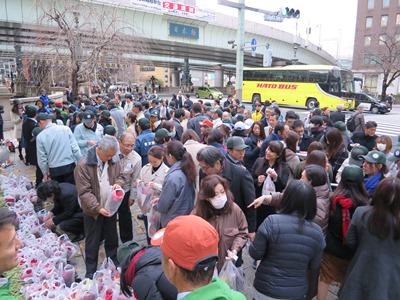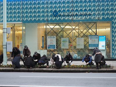 今回のイベントでは、この隙間に植えるために合計1万本ものチューリップの球根が用意され、花奉行・水奉行・町会の方々 200名近くで力を合わせ、植え付けを中心とした花壇の手入れが実施されました。