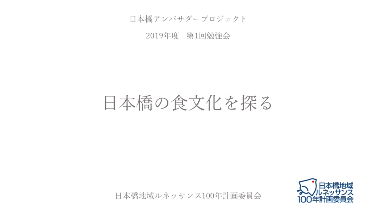 「日本橋地域ルネッサンス100年計画委員会」が開催した「日本橋アンバサダープロジェクト 2019年度第1回勉強会」。