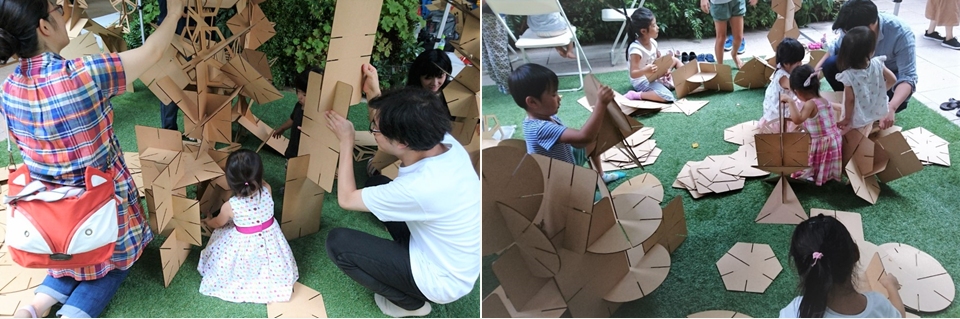 クミカはスリットが入った木版のパーツを組み合わせて、立体を作るおもちゃ。Drawing Heads Fukuoka一級建築士事務所と、福岡を拠点に横断的な分野でものづくりを行うクリエイティブ集団anno lab(あのラボ)によって共同開発され、子どもたちはクミカで遊びながら平面から立体への構造の変化を学ぶことができます。当日は、あのラボのメンバー自らが子どもたちにクミカの遊び方を伝授。他方、子供たちの自由な想像力から生まれる予想外の組み上げ方にメンバーが驚く場面も。集中して作品に取り組む子どもたちの姿は微笑ましくもあり、頼もしくもありました。