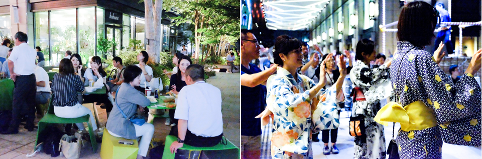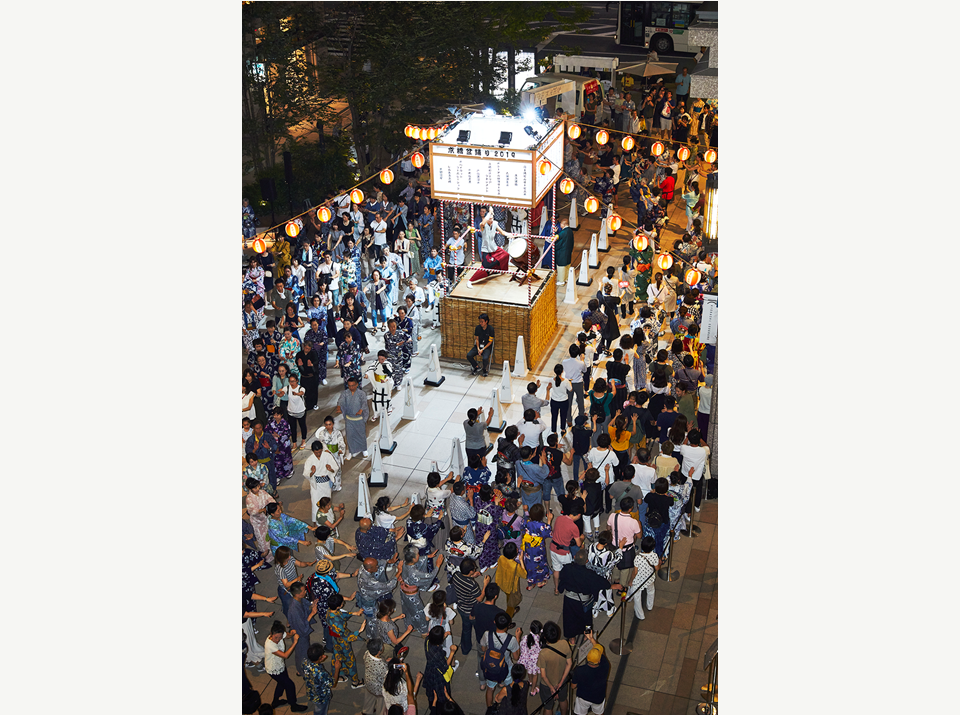 夏の終わりはオフィスビルに囲まれた会場で、盆踊りを楽しむのもいいかもしれません。