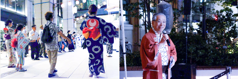 2017年に約50年ぶりに復活し、今年で3回目となる「京橋盆踊り」。オフィスや飲食店が入り、駅からも直結して行くことが可能な京橋エドグランに音頭が響きます。