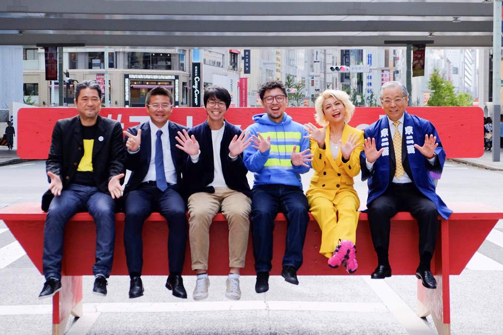 写真左から、「東京ビエンナーレ2020」総合ディレクター 中村政人氏、「TOKYO BENCH PROJECT」協賛企業・東京建物まちづくり推進部 久間田尚紀氏、デザイン監修・ツバメアーキテクツ 藤本亮太氏、企画・グランドレベル 大西正紀氏、田中元子氏、京橋一之部連合町会会長 冨田正一氏