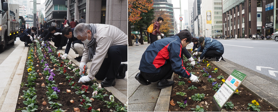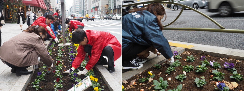 京橋~日本橋本町にかけての中央通りには、四季を彩る花壇が設置されていて、現在は色とりどりの「パンジー」が中央通りに彩りと潤いを与えています。