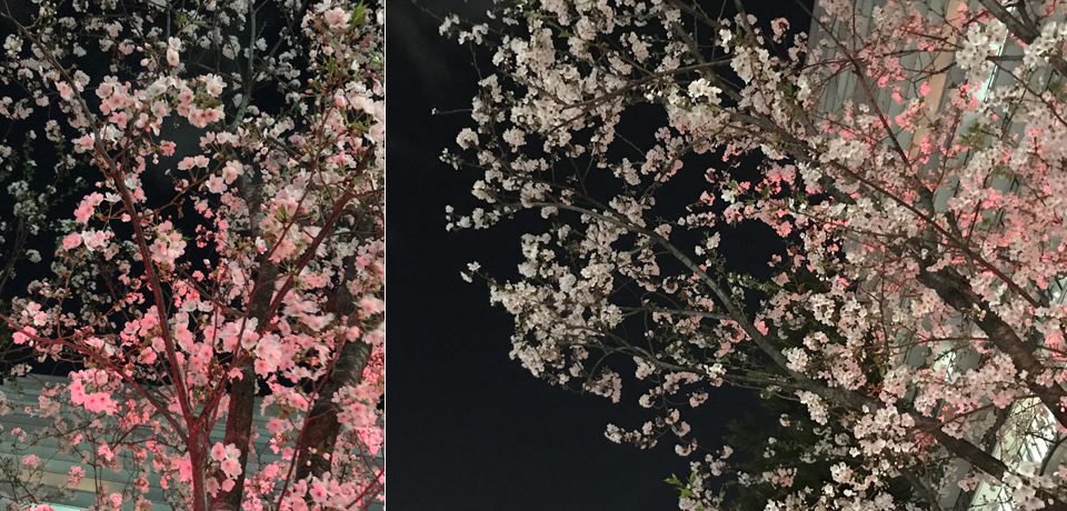 東京スクエアガーデンのSakura Light Up。赤いライトに下から照らされた桜は、存在感のある印象です