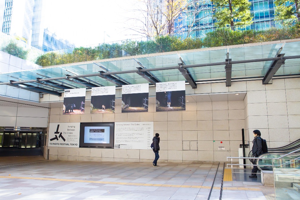 2020年のT3は展示とオンラインイベントによって構成され、展示企画は、①企画展「Jumping Between The Codes -変容のはざまから-」、②第7回 東京国際フォトコンペティション受賞者展「Turbulence」、③T3 PHOTO FESTIVAL TOKYO PRE 2019 学生プレゼンテーション受賞者展「mamono,2020」の3つ。本稿では、東京駅へもほど近いオフィス街・京橋の複合ビル「東京スクエアガーデン」の公開空地で行われた①企画展を中心にレポートします。